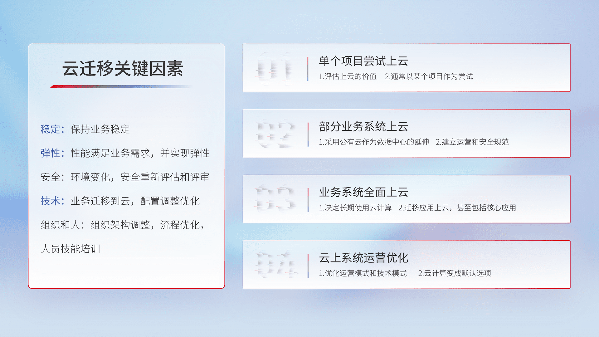 结合实际业务,,,,从规划设计、、、云平台选型、、云原生改造、、数据迁移、、、、集成交付,,迁移全过程为客户识别最佳上云路径,,做好风险识别管理,,设计网络架构、、、身份权限、、安全审计合规、、操作审计、、、、日志审计、、监控告警策略、、多站点容灾设计等,,,,对云上基础设施进行整体规划,,,,提升IT治理水平,,,,以满足弹性、、高可用、、高性能的需求。。。