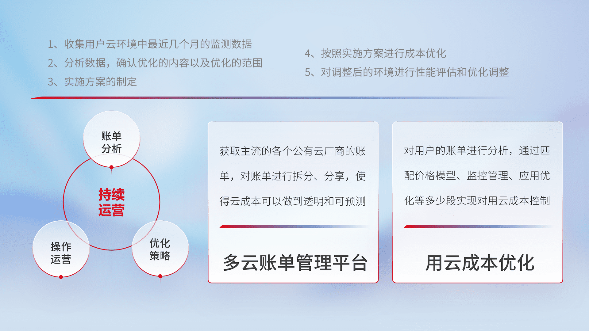 通过多云纳管,,,,以统一的资源数据模型把客户的云资源进行抽象和封装,,,进而实现对多云资源的统一操作,,,,保障云资源管理的可靠性、、稳定性与可用性。。。量身定制化运维内容,,,配置、、、、开发运维、、、、补丁管理、、、备份、、监控、、、、认证和访问管理、、、审计和日常巡检等,,,,保障在用云过程中的可靠度,,,稳定度以及高可用率。。。。